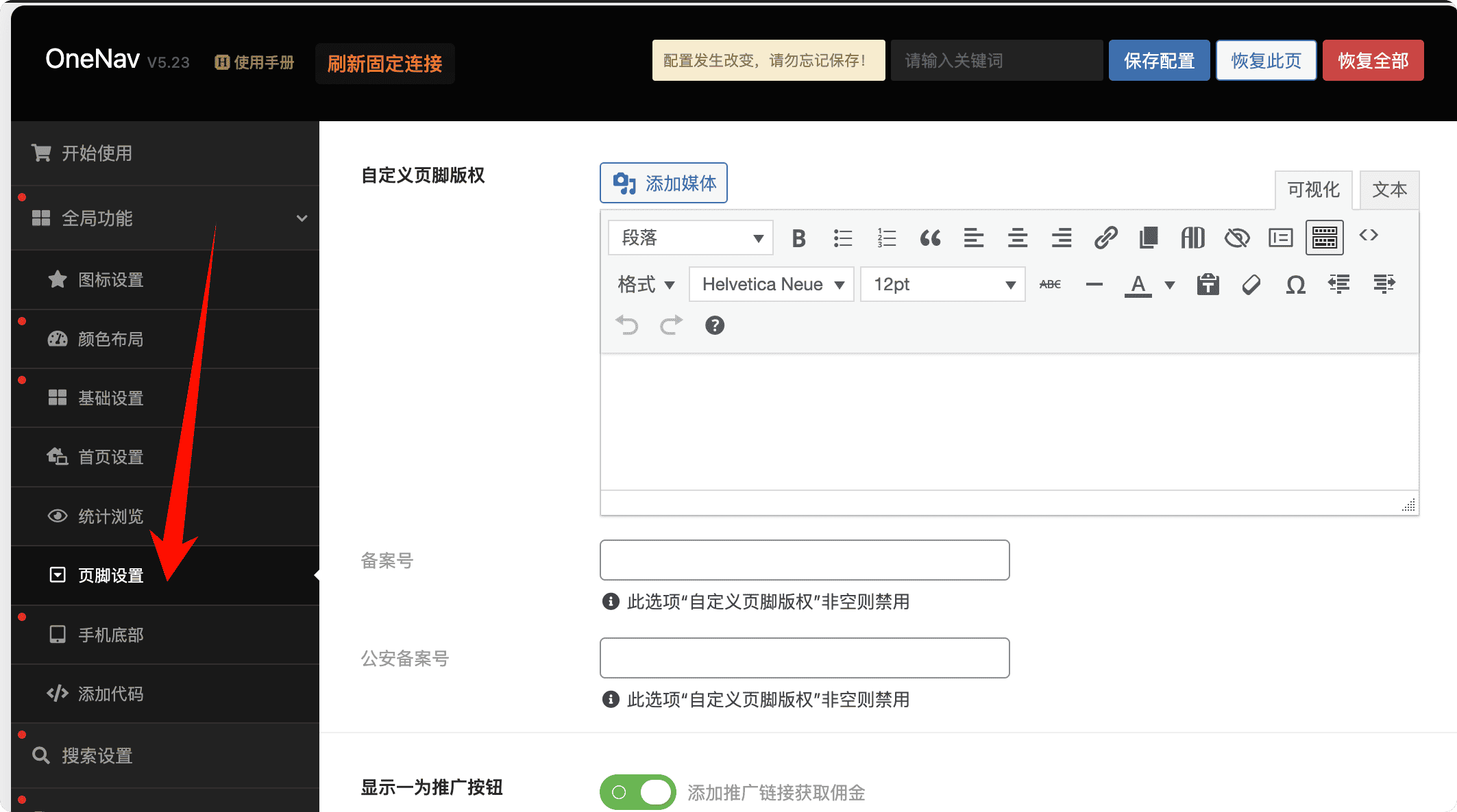 页脚版权可自定义,在主题设置的页脚设置。注意:“备案号”和“自定义页脚版权”只能二选一。