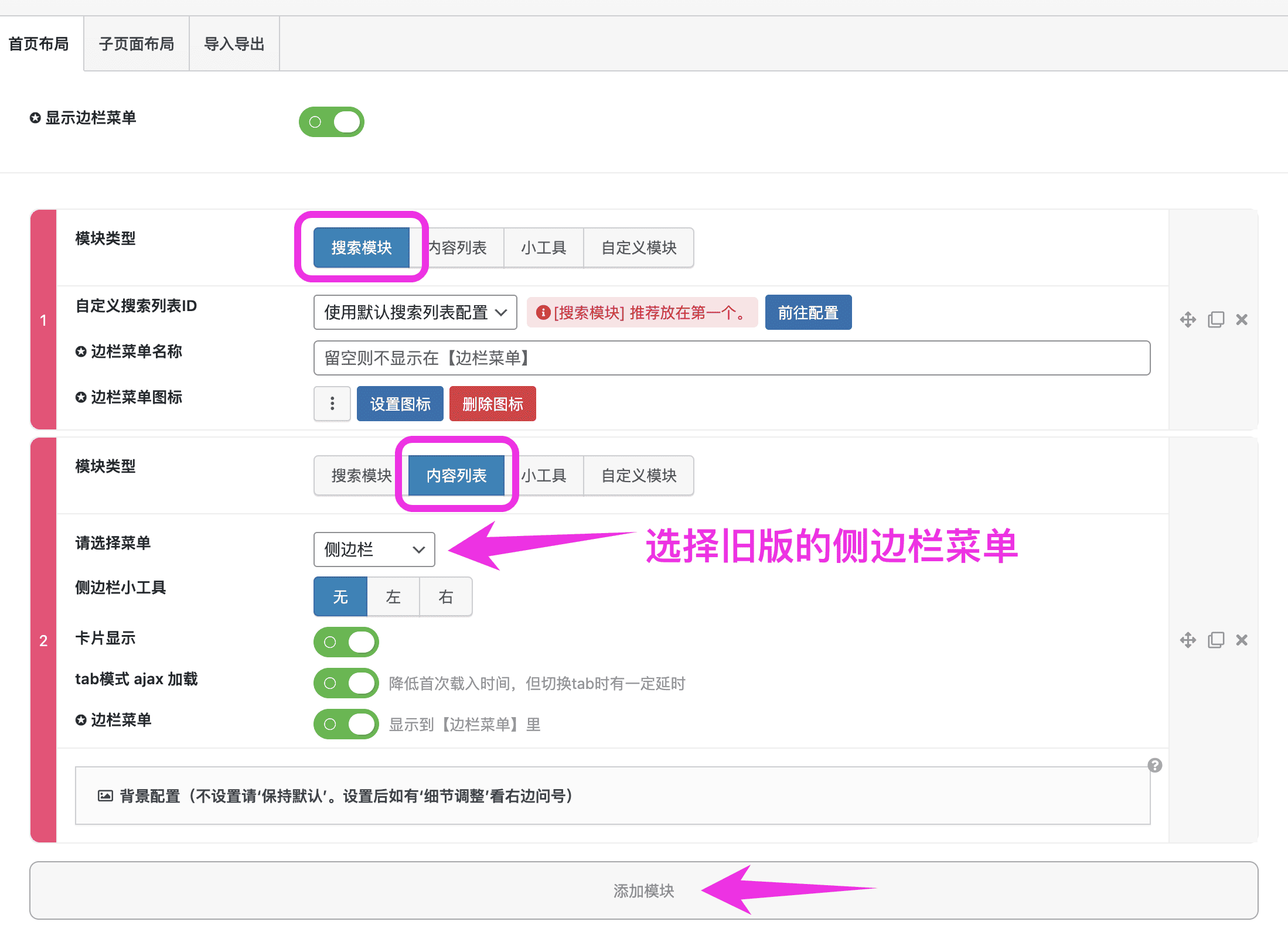 首页布局这wp后台的“首页布局”模块按钮里,目前共有4种模块:搜索模块、内容列表、小工具、自定义模块。