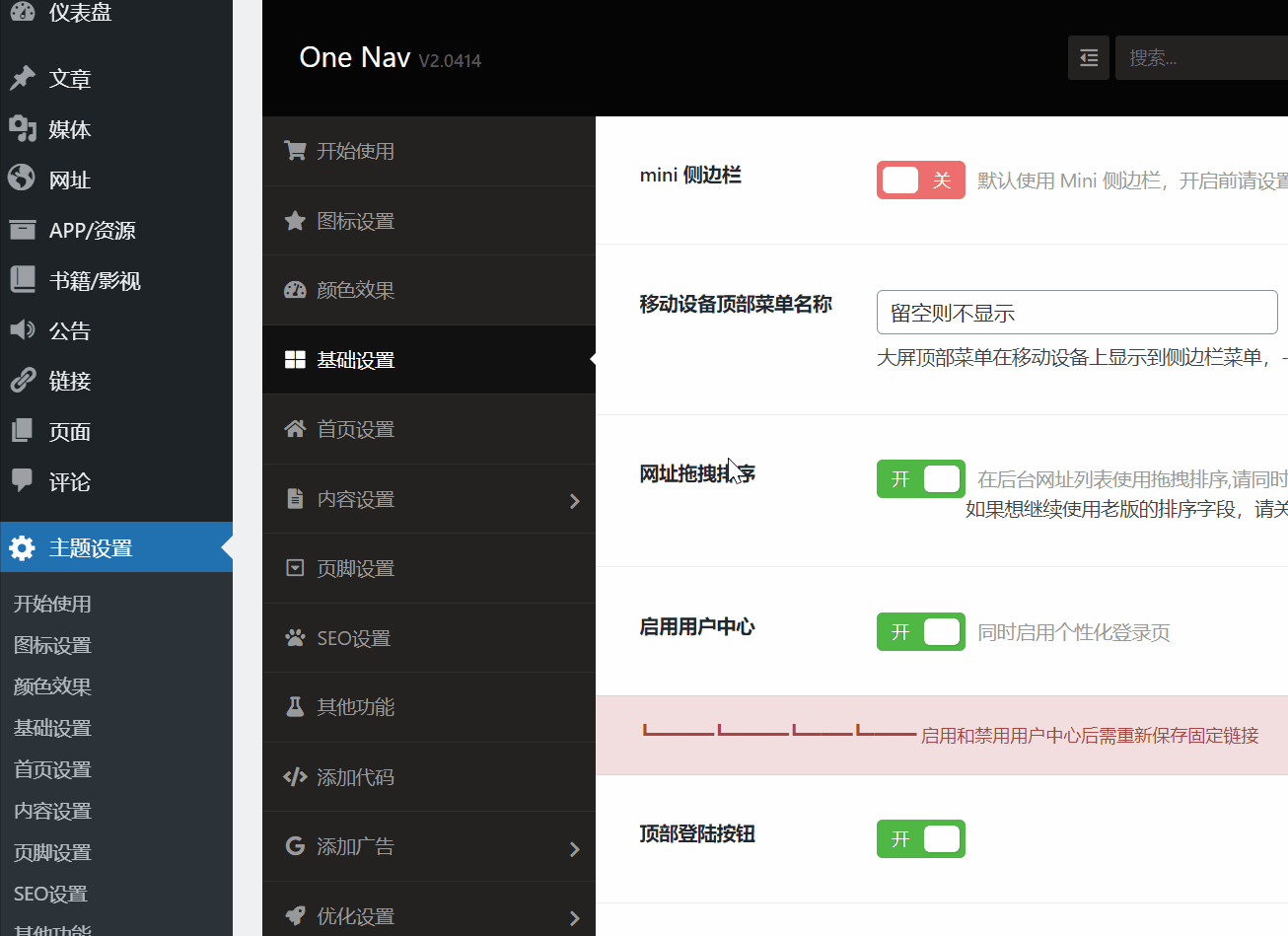 OneNav主题要启用网址块拖拽排序,需先按照下图开启相关选项:
